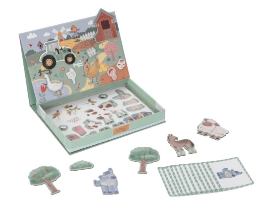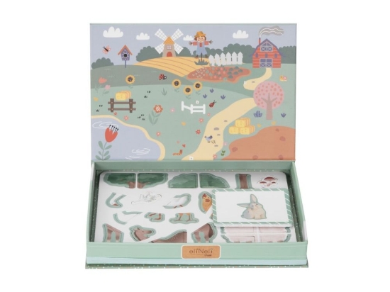 Magnetna Farma 2u1 igra (magnetna igra + slagalica) vodi djecu na selo, gdje mogu vidjeti životinje koje obično susreću u svom okruženju. Farma životinja, prikazana u svom stvarnom obliku, daje igri realističan dodir. Samo otvorite poklopac kutije i krajolik s poljima, livadama, drvećem i cvijećem širi se pred djecom, a na njima je da koriste svoju maštu kako bi dovršili sliku pomoću magnetskih dijelova slagalice. Životinje, traktor ili staja jednostavne su slagalice s kojima djeca mogu samostalno igrati. Mogu koristiti dijelove za izgradnju krave, plišanog svinja, ovce, magarca ili, kako bi igra bila zanimljivija, mogu uzeti hrpu kartica i pokušati oponašati ilustracije na karticama.