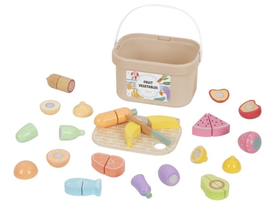 Set drvenih rezalica za hranu - voće, povrće i druga hrana je izvrstan dodatak dječjoj kuhinji. Uz drvene namirnice, djeca mogu lako pripremiti užinu za svoje lutke, plišane životinje, prijatelje i roditelje. Poznato voće i povrće, upotpunjeno ribom i mesom, učinit će svaki obrok zanimljivijim. Hrana koju djeca pronađu u kutiji također je rezljiva. Uz pomoć daske za rezanje i drvenog noža (koji je uključen), djeca mogu sigurno rezati hranu na polovice, koje mogu ponovno spojiti pomoću čičak trake. Igrajući se s hranom i režući, djeca će vježbati rezanje, poboljšati motoričke vještine, spretnost, koordinaciju oka i ruke, razvijati maštu i kreativnost, igrati se uloga i graditi socijalne veze. Zbog praktične kutije, rezanje hrane je lako prenosivo i brzo se posprema.